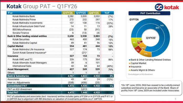 Consolidated PAT for Q1FY26 increased to ₹ 4,472 crore, up 1% YoY from ₹ 4,435 crore in Q1FY25 (excluding gain of KGI divestment in Q1FY25).