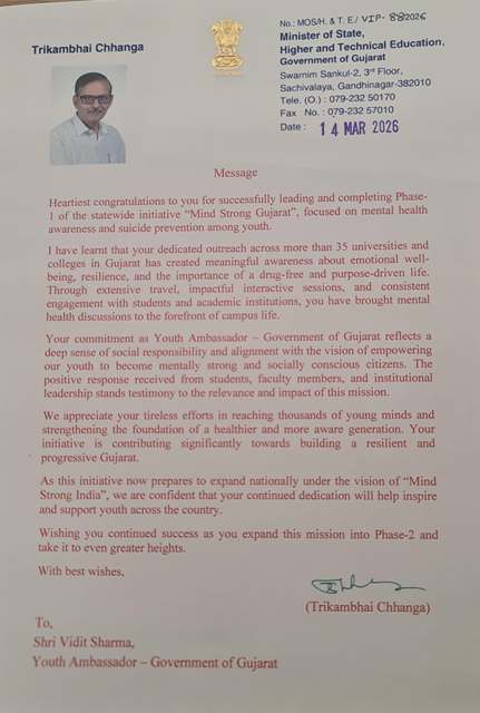 GANDHINAGAR, GUJARAT | 17th MARCH 2026 — The Hon’ble Minister of State for Higher and Technical Education, Government of Gujarat, Trikambhai Chhanga, has congratulated Vidit Sharma, Youth Ambassador – Government of Gujarat, for successfully completing Phase‑1 of the statewide initiative “Mind Strong Gujarat.”